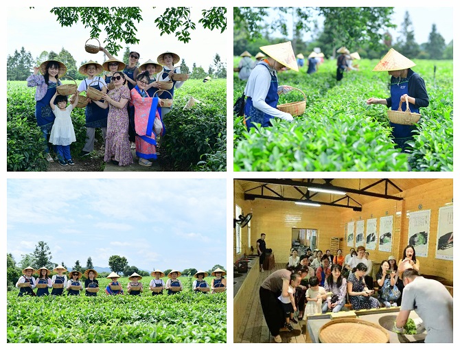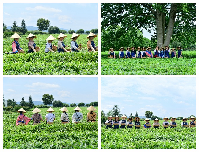 一芽一叶一抹香,一人一篓采茶忙。万亩茶田,一派生机勃勃的翠绿,美不胜收。当地茶农介绍了茶的品种、采茶方法等知识后,女职工身着浓厚茶文化元素的采茶服装,腰系茶篓穿行在散发着新鲜茶香的茶山间,一边寻找“一芽一叶”,一边采摘。大家谈笑风生,欢声笑语、悠扬歌声不时从茶田里传来,茶园里洋溢着欢快的氛围。