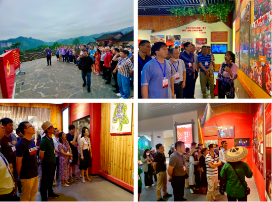 十步之内,必有芳草。湘西州每一寸土地,都镌刻着红色革命时代精神印记。活动首站来到了“精准扶贫”的首倡地——湘西自治州花垣县十八洞村。在“十八洞村精准脱贫之路”主题展览厅,大家依次参观了“总书记来到十八洞村”“好日子是干出来的”“幸福的笑脸”“精准扶贫从这里出发”等四个陈列版块,一张张照片、一个个数据,还原出过往场景,拔穷根、摘穷帽,因地制宜、实事求是,让绿水青山变成金山银山,点亮了十八洞村民的幸福梦。幸福是奋斗出来的。脱贫展厅内,村民们幸福的笑容映在了参观者的心中。沿着习近平总书记的足迹,聆听总书记关心关怀十八洞村村民的暖心故事,大家感受到党精准扶贫的伟大创举和脱贫攻坚政策给湘西山区带来的翻天覆地变化。“我志愿加入中国共产党,拥护党的纲领,遵守党的章程……”在精准扶贫广场前,学院党委书记肖来荣带领全体党员肃穆起敬,面对鲜红的党旗,用铿锵的语言、坚定的承诺,重温入党誓词。