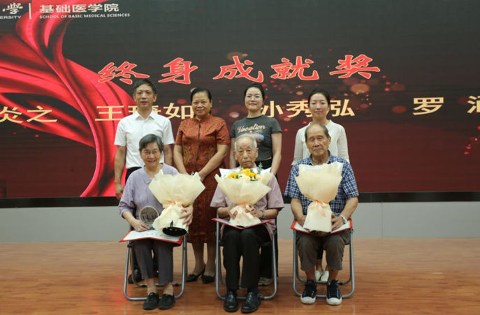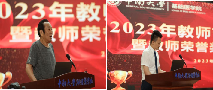 随后,两位获奖代表发表获奖感言。国家教学名师、基础医学院原院长、卓越成就奖获得者文继舫教授表示,感谢学院历届领导老师的信任、支持和肯定,他将永远以学院为家,永远爱家、以爱育人,继续坚守好老师的初心和本分。优秀教师奖获得者王俊普副教授表示,作为一名教师,能得到同学的认可,是最大的满足和幸福,能得到学院的肯定,是最大的鼓励和鞭策,自己将珍惜荣誉、勤勉工作。