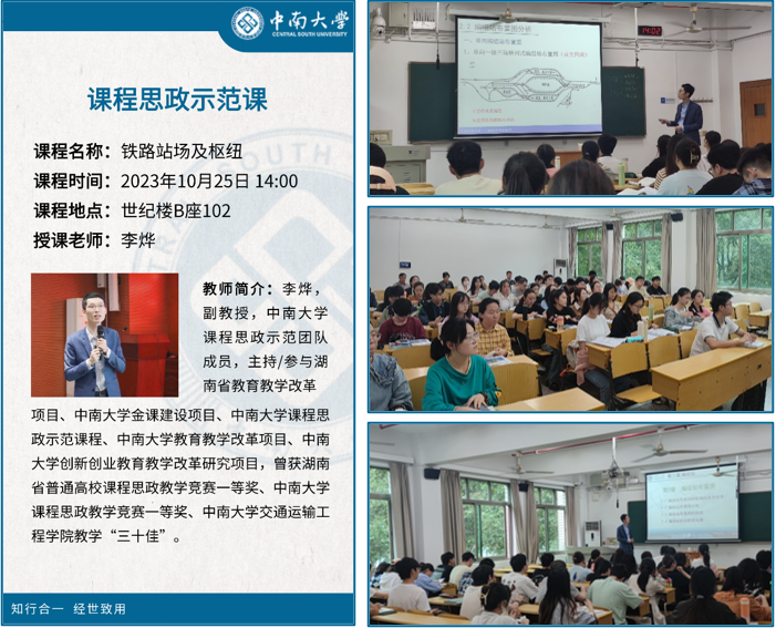 为深入贯彻落实习近平总书记关于教育的重要论述和全国教育大会精神,教育部《高等学校课程思政建设指导纲要》、《全面推进“大思政课”建设的工作方案》等文件精神,充分发挥学院课程思政教学研究中心的主体作用,提高人才培养质量,1025日,交通院课程思政教研中心在铁道校区世纪楼B102,举办了一次课程思政示范课活动。