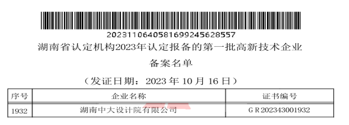116日,全国高新技术企业认定管理工作领导小组办公室对湖南省2023年认定的第一批高新技术企业进行了备案公告,中大设计院位列其中,这标志着中大设计院连续第五次获得了“国家高新技术企业”资格。