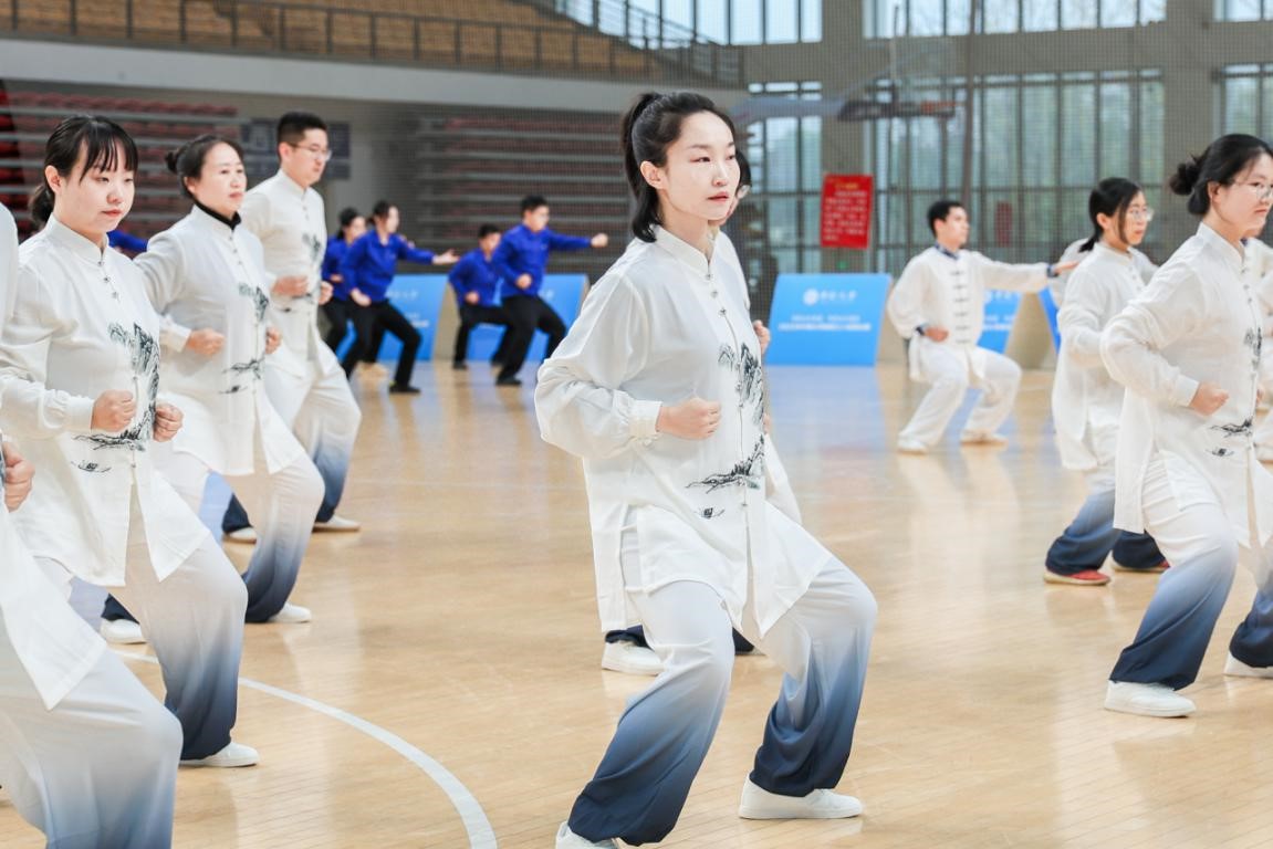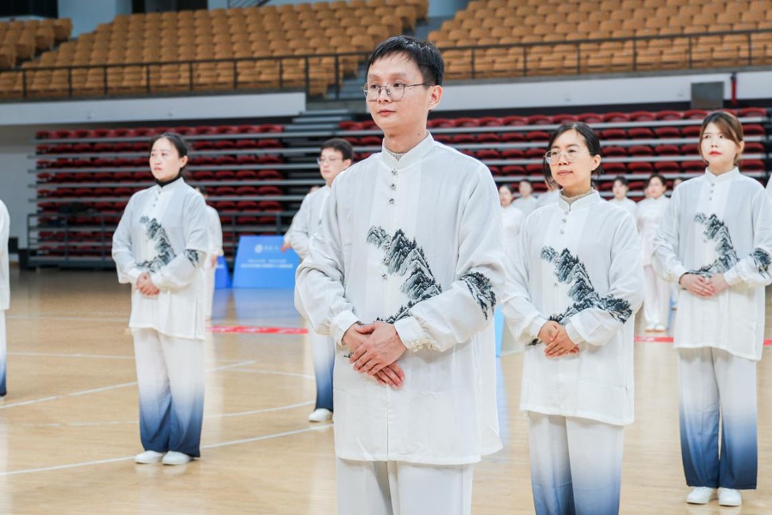 赛场上,随着悠扬的音乐响起,老师们迅速进入状态。在“双手托天理三焦”的招式比拼中,队员们动作舒展,如擎天玉柱,尽显舒展大方;在“左右开弓似射雕”的招式较量中,队员们马步沉稳,开弓有力,展现了刚柔并济的力道;在“摇头摆尾去心火”的招式展示中,队员们身姿柔韧,流转自如,将身心调和融入一招一式;在“背后七颠百病消”的招式收势中,队员们提踵颠足,节奏轻灵,共同展现了身体的协调与平衡。整个赛程,公共管理学院代表队动作整齐划一,呼吸与动作完美配合,将力与美、形与神融于一体,成为赛场上一道亮丽的风景。